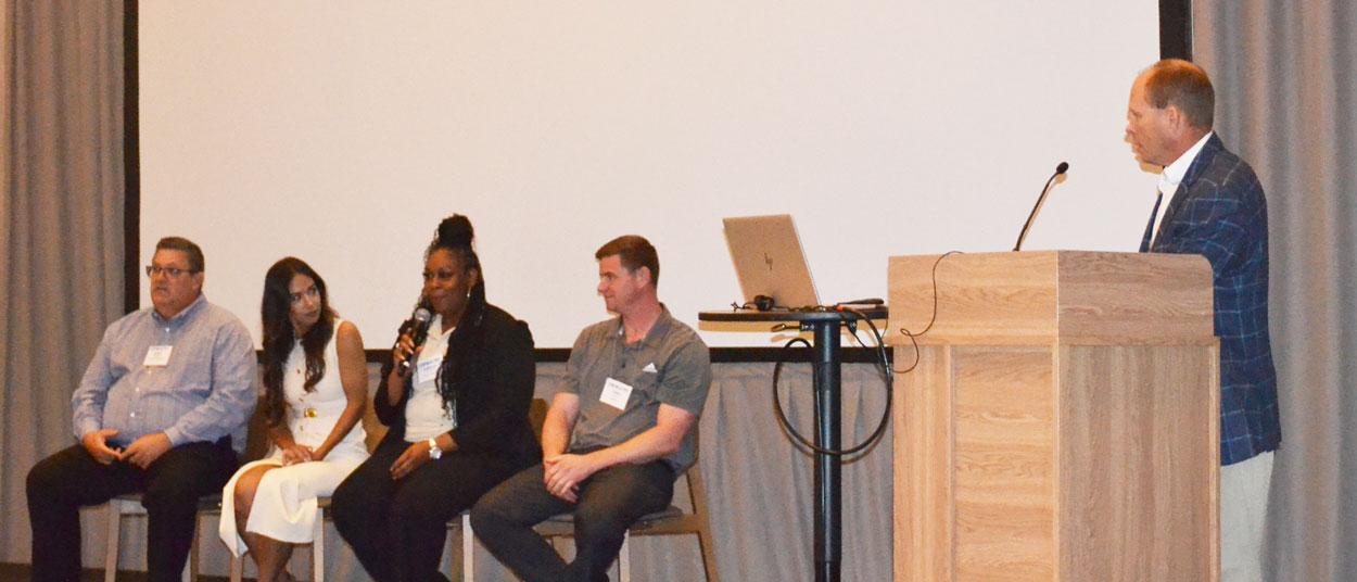(L to R) A panel discussion on “Dealing with Conflict and Negotiation Skills,” including Jason Gorham, vice president of human resources at 3D Corporate Solutions; Salam Safi, vice president of human resources at Darling Ingredients; Latonya Jordan, senior human resources business partner at Tyson Foods Inc.; Colin Acedo, director of operations at Pilgrim’s; and moderator Barry Griffith, senior managing engineer at Tyson Foods Inc.